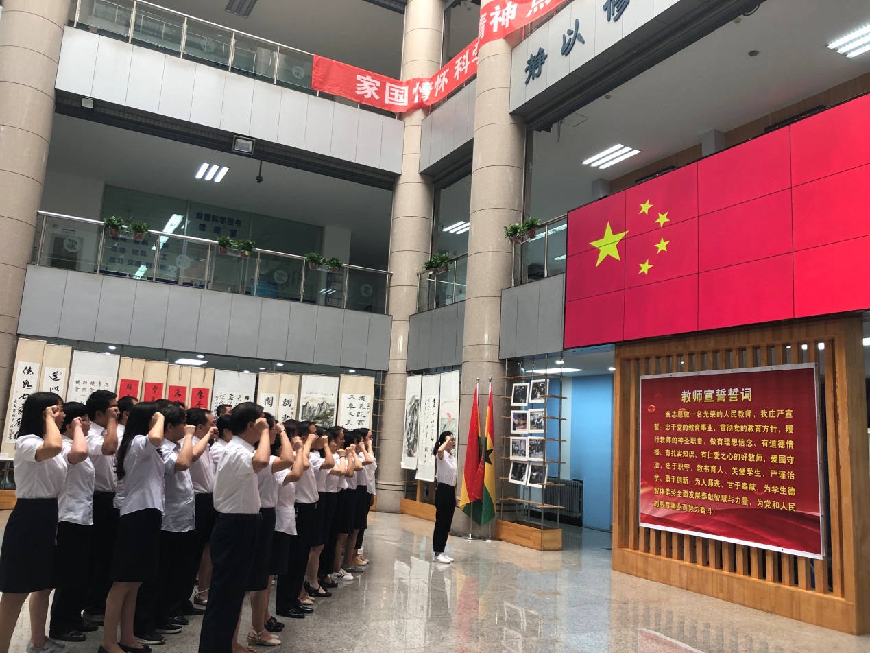 在校史馆,全体教师重温历史,认真了解了陕西工院的历史发展进程、特色文化底蕴和取得的巨大成就;随后,全体教师共同学习了《新时代高校教师职业行为十项准则》和《高等学校教师职业道德规范》;最后,全体教师高唱国歌,在青年教师康瑾老师的带领下整齐肃立,面对国旗进行了庄严宣誓。