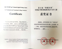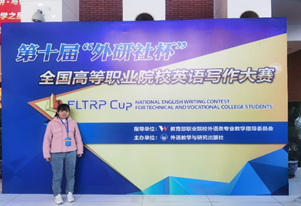 2019年12月7日,由教育部职业院校外语类专业教学指导委员会指导,外语教学与研究出版社主办的第十届“外研社杯”全国高等职业院校英语写作大赛总决赛在北京举办。公共课教学部教师花丹指导的我院网络1801班赵晨晨同学代表陕西省参加公共英语组写作比赛总决赛,与来自全国百余所高职院校的174名选手共同竞赛,获得三等奖。