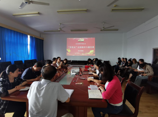 在庆祝建党100周年,开展党史学习教育及第四个纪律教育学习宣传月活动的关健时期,6月18日下午,公共教学党总支书记南欢同志以红色经典歌曲“《三大纪律八项注意》的诞生和发展”为题,在崇文南楼711为公共教学党总支第一、第二支部全体党员,上了一堂“学党史”纪律教育专题党课。