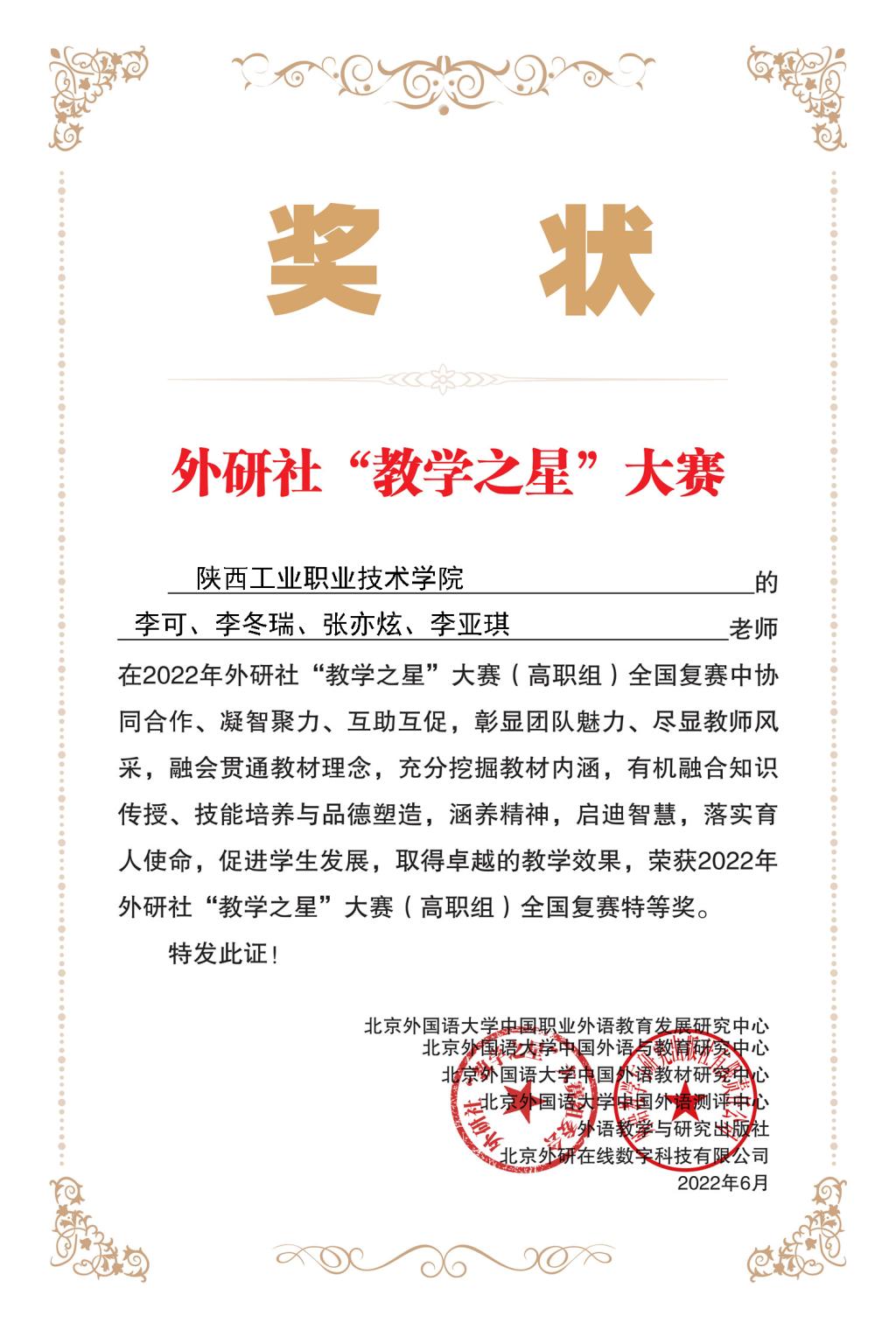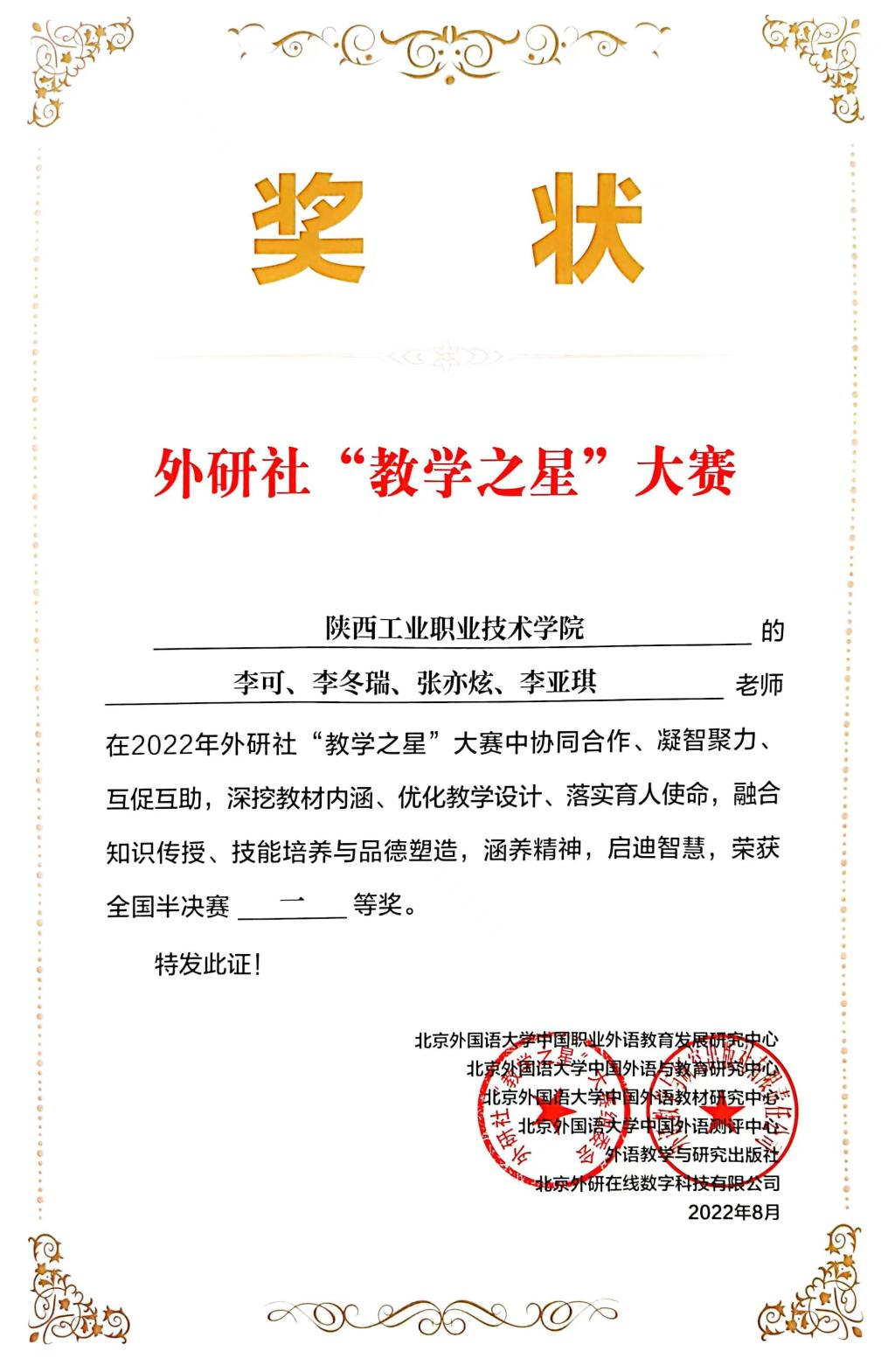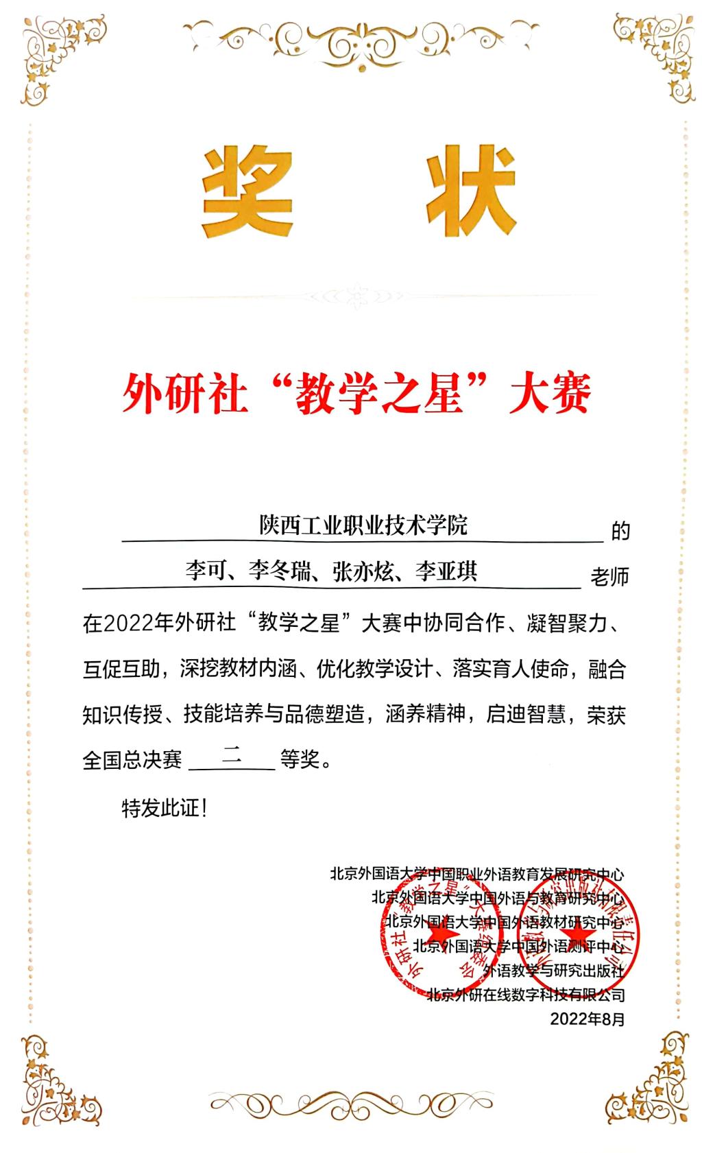 近日,由教育部高等学校大学外语教学指导委员会和外语教学与研究出版社共同主办的2022年外研社“教学之星”大赛(高职组)全国决赛落下帷幕。本次大赛以面向全国云端直播的形式举行,职业院校英语教师近3万人次云端观看。我校公共课教学部组成的教师团队李可、李冬瑞、张亦炫、李亚琪老师,在与全国众多高校优秀参赛教师队伍的激烈角逐中,最终荣获全国半决赛一等奖暨全国总决赛二等奖。