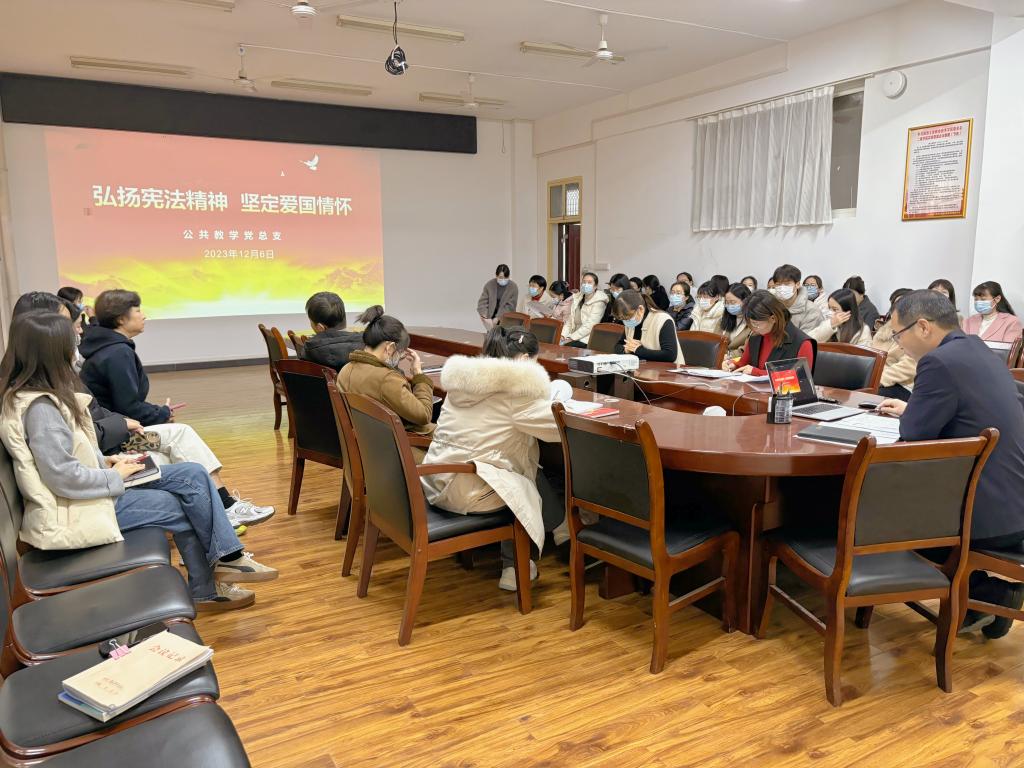为认真学习宣传贯彻党的二十大精神、习近平法治思想和习近平总书记关于宪法法治教育的重要指示精神,为增强教职工法治观念和爱国情怀,12月6日下午,公共教学党总支以“宪法宣传周”系列活动和《中华人民共和国爱国主义教育法》为内容开展了“弘扬宪法精神,坚定爱国情怀”主题党日活动,公共教学部党总支书记苏宏志为部门全体教师讲授党课。