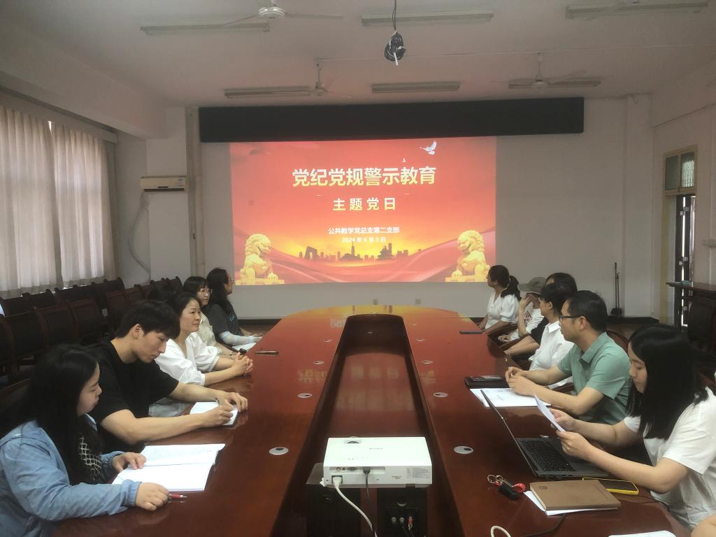 为进一步推动支部党纪学习教育,明确党员日常言行的衡量标尺,真正使学习党纪的过程成为增强纪律意识、提高党性修养的过程,6月5日,公共党总支教师第二党支部在崇文楼A501会议室开展了“党纪党规警示教育”主题党日活动,活动由党支部书记刘姗姗主持,教师第二支部全体党员参加了活动。